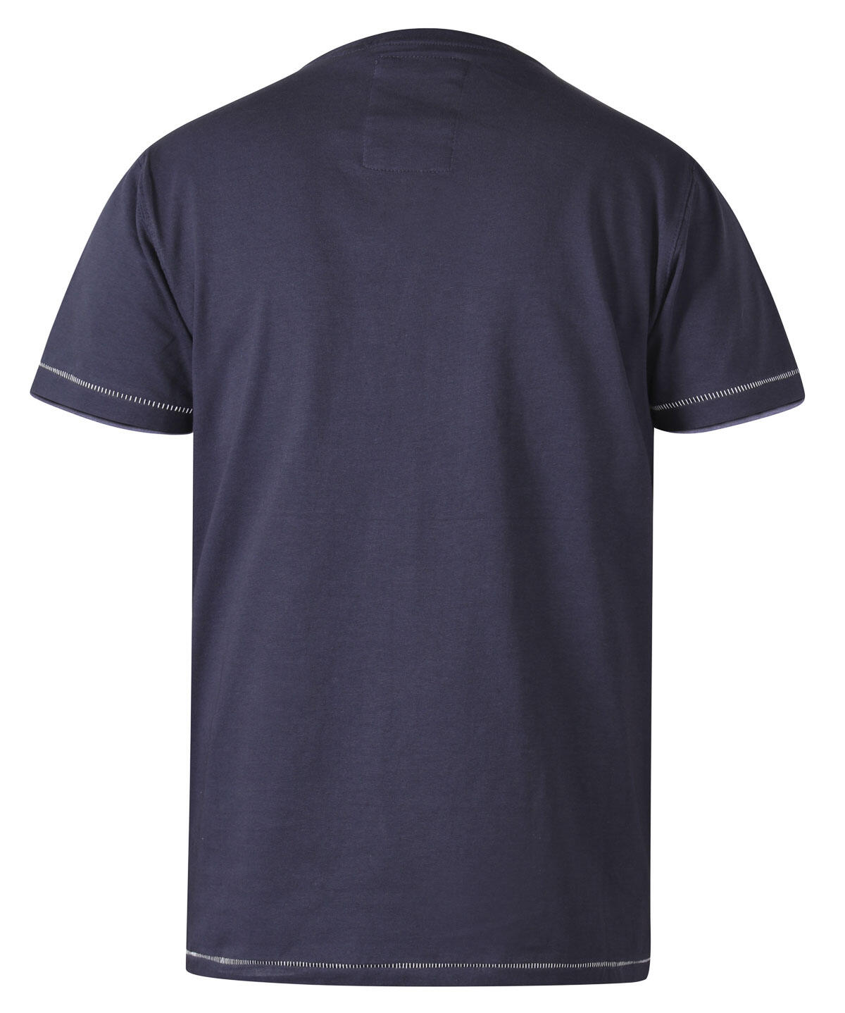 Navyblå T-shirt fra D555 med ekstra længde, til den høje mand. T-shirten har et tryk med en folkevogn og teksten 'Volkswagen Camper 1950, The Original Beach Bus' som står med blå og hvid tekst.