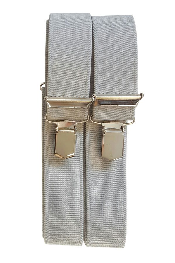 Lysegrå brede seler. Selerne er 3,3 cm brede. Selerne har kraftige klemmer som "bider" sig fast og holder dine bukser på plads.