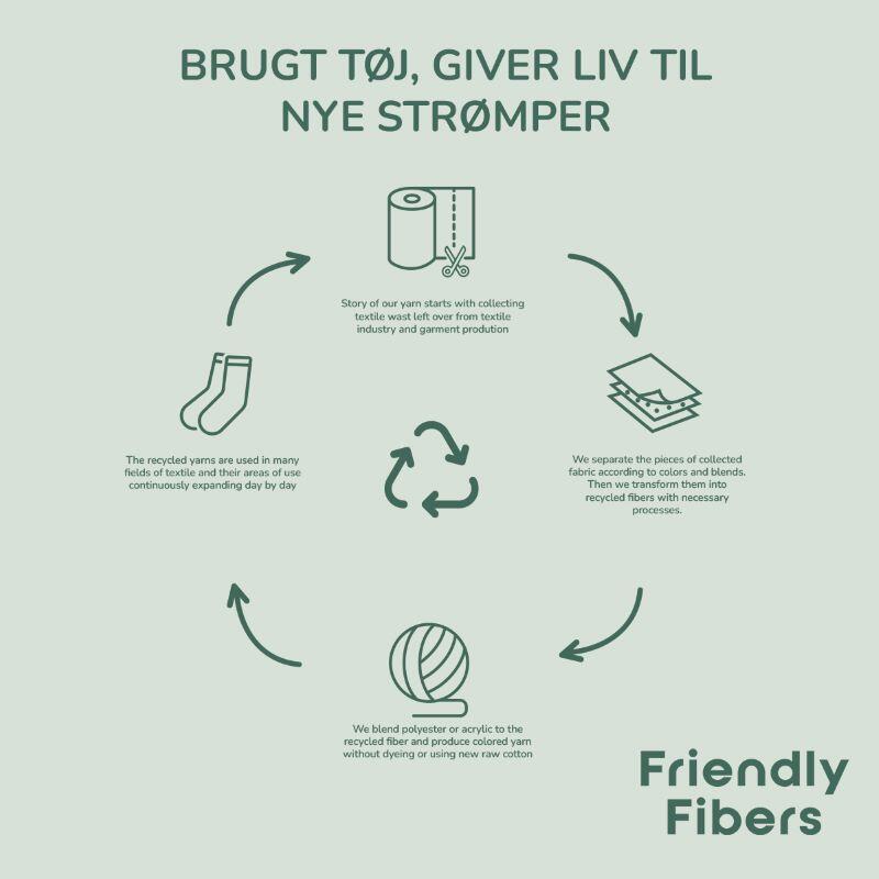 Strømperne er produceret med 80% genanvendt bomuld, som kommer fra tekstilproduktionernes rester.