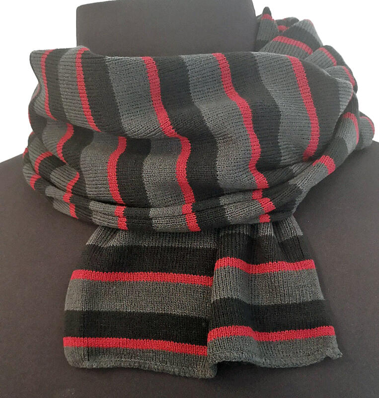 Et lækkert stribet tørklæde / halstørklæde sort/rød og koksgrå farver.