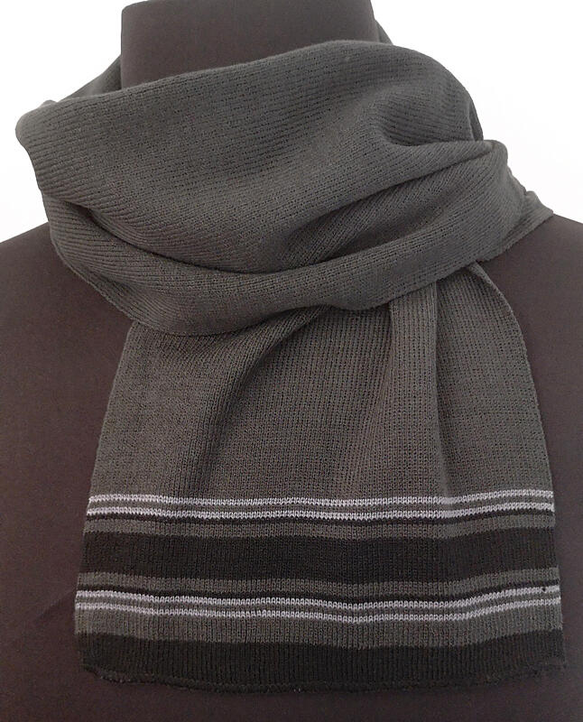 Et lækkert tørklæde / halstørklæde i grøn/grå med sort og grå kontrast striber i enderne.