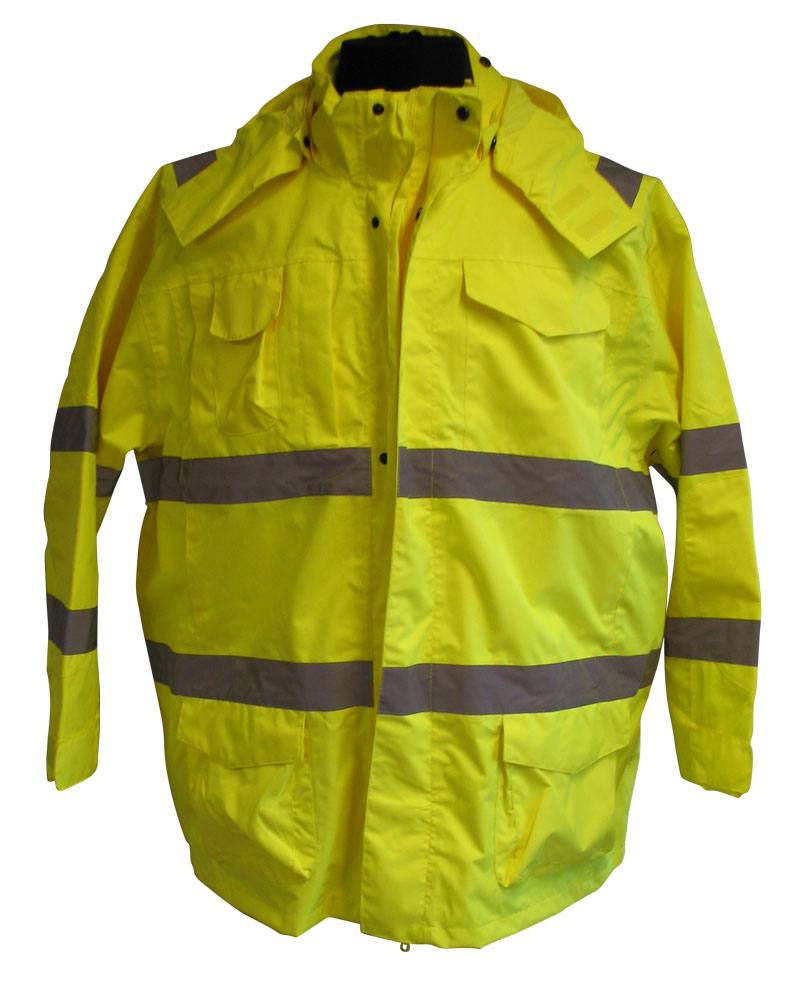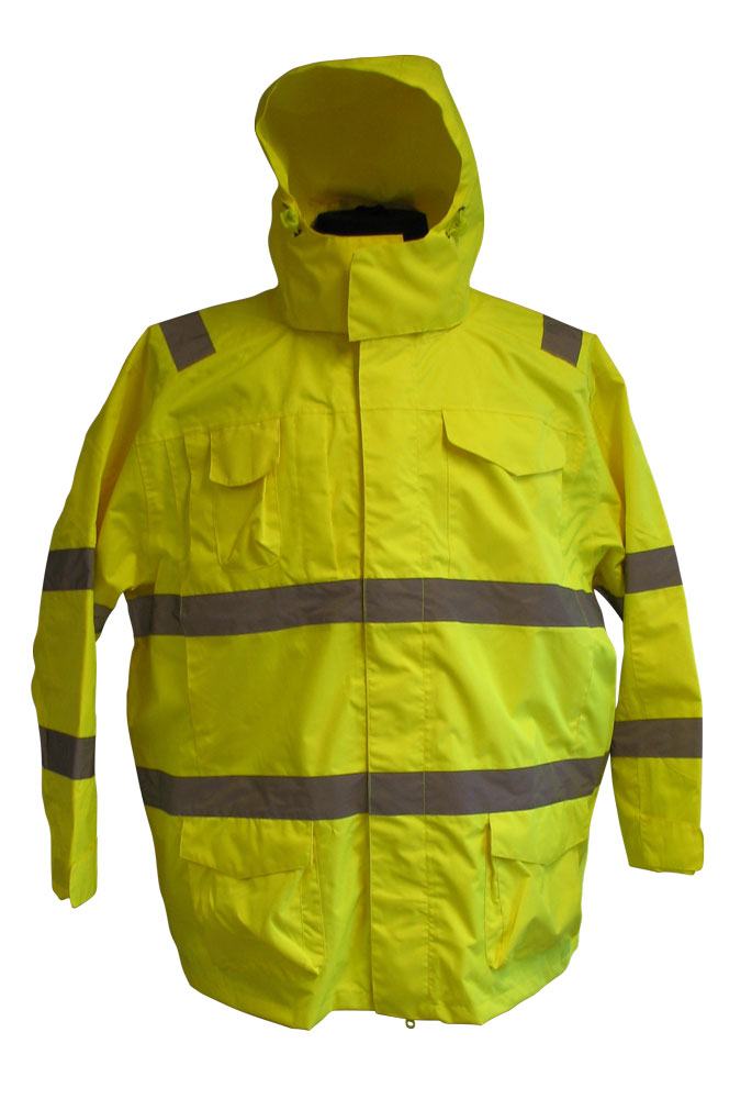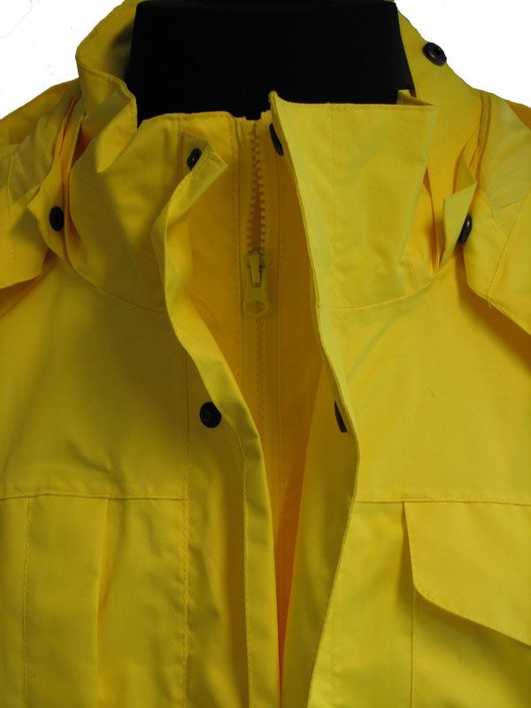 Arbejds regnjakken er gul og med reflekser. Jakken har aftagelig hætte. Hætten kan kan lukkes tæt med snoretræk og der er ekstra lukning ved halsen som lukkes med en velcro lukning.