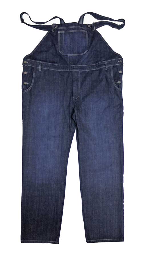 Farven er denimblå, men disse smækbukser har mange lyse stikninger rundt om lommer, remme og kanter.