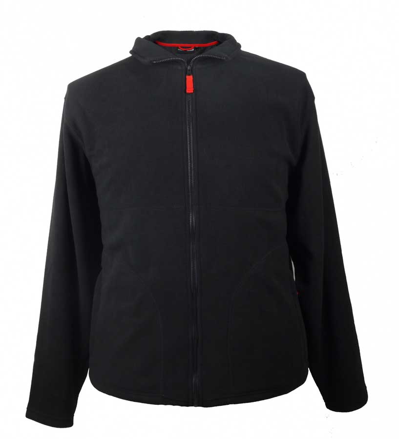 Den sorte fleecejakken lukkes med lynlås, og den har to lommer foran der også lukkes med lynlås. Alle tre lynlåse har et rødt stykke stof viklet om lynlåsens slæde.