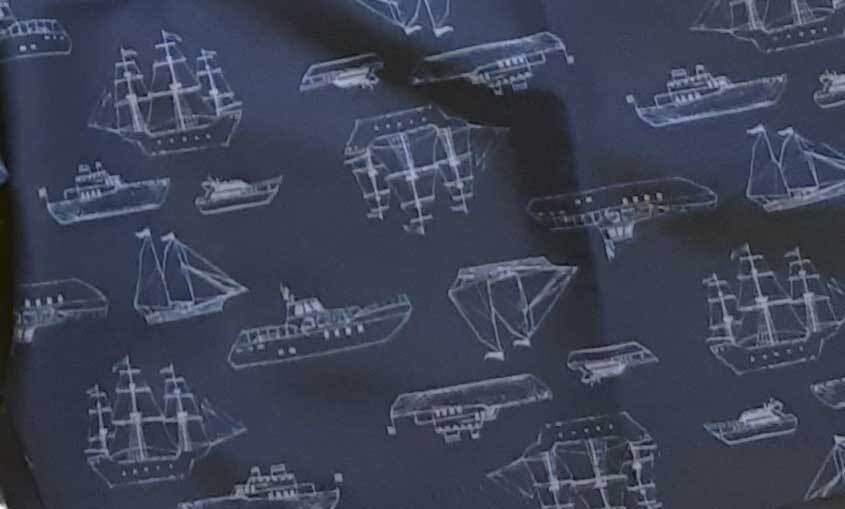Navyblå badeshorts fra Ceceba. Badeshortsene har print af forskellige skibe. Der er to stiklommer foran og en baglomme med velcrolukning.