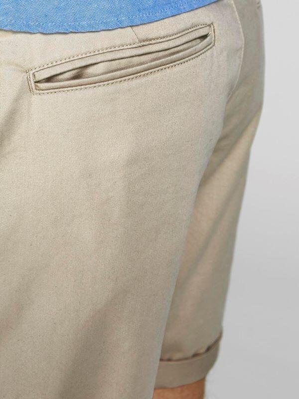 Lys sand chino shorts fra Jack & Jones. Shortsene er en blanding mellem en formel og en afslappet 5-lomme-stil. Der er to baglommer og tre lommer foran.