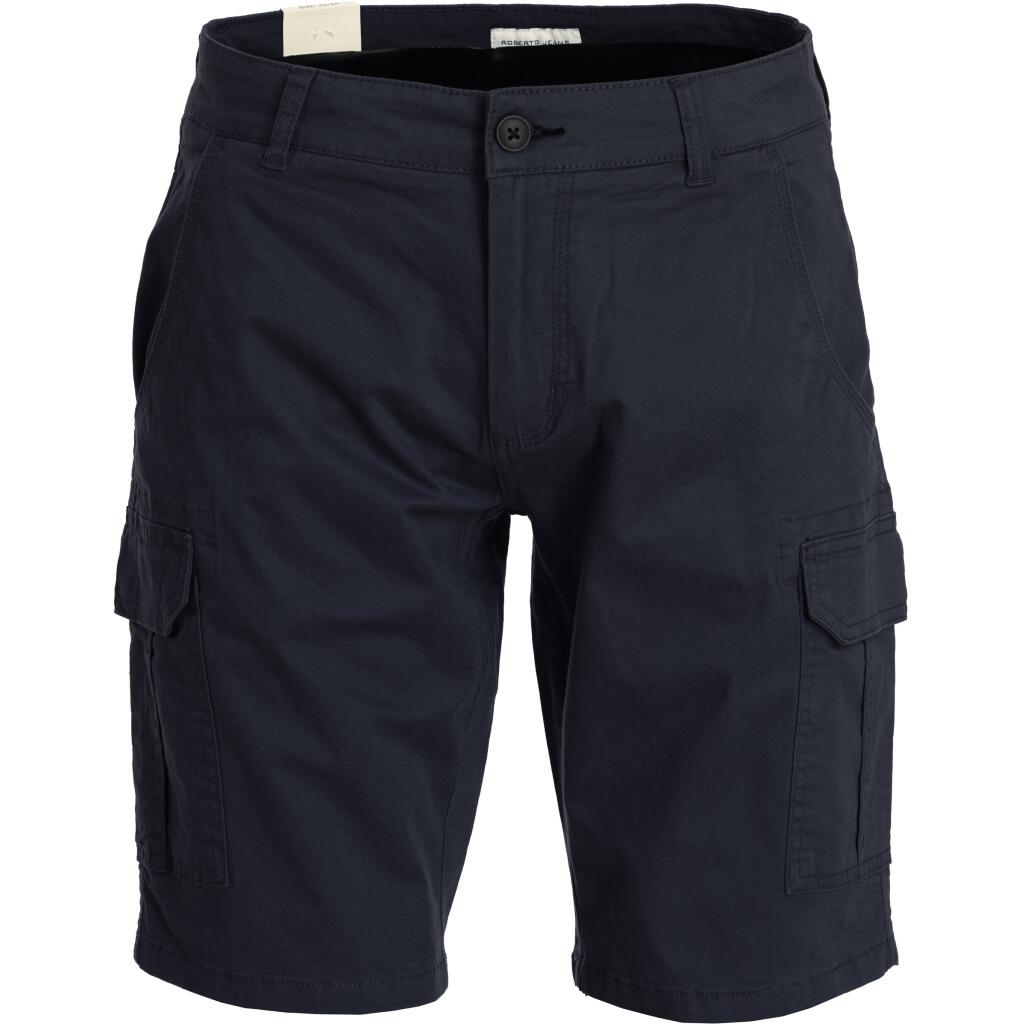 Disse mørkeblå cargoshorts er lavet i et slidstærkt bomuldsstof og har et funktionelt design med masser af lommer. Foran får du to skrålommer og to rummelige cargolommer på lårene - begge med klap og velcrolukning. Bagpå er shortsene udstyret med to ekstra baglommer, også med velcro, så dine ting bliver, hvor de skal.