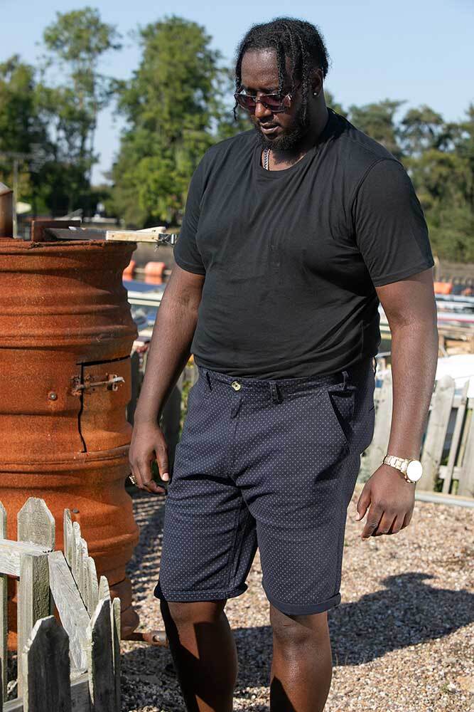 Der er ombuk på buksebenene, hvilket nemt kan lægges op eller ned. Knapperne i shortsen er i et lækkert "trælook".