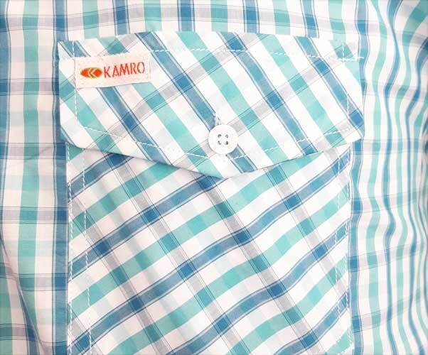 Skjorten er ternet i hvide, blå og grønne nuancer. Farverne kan være svære at gengive på billeder men farverne er ramt bedst på close-up billedet af lommen.