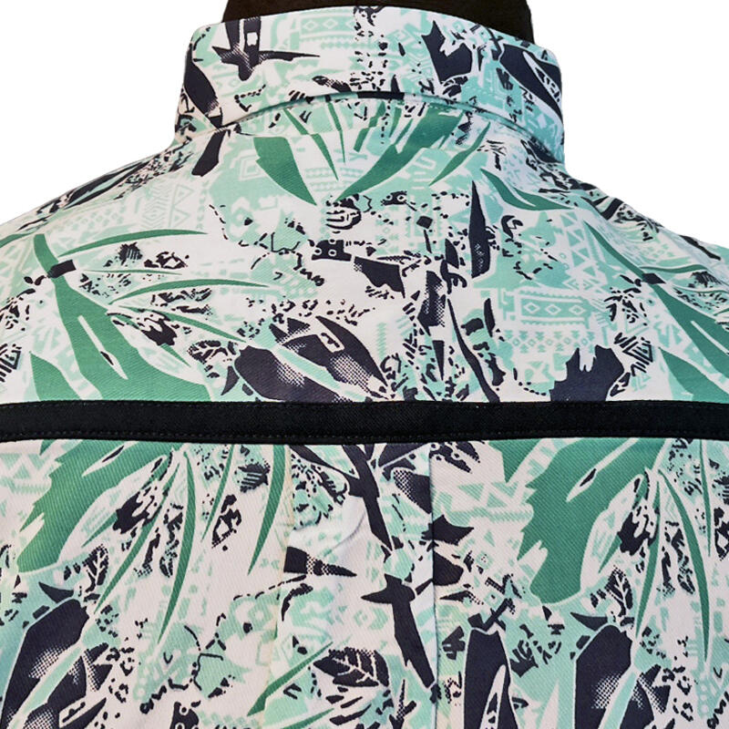 Bunden af skjorten er hvid, med mintgrønne aztekiske mønstre, oven på disse er der grønne og navy abstrakte palmeblade.