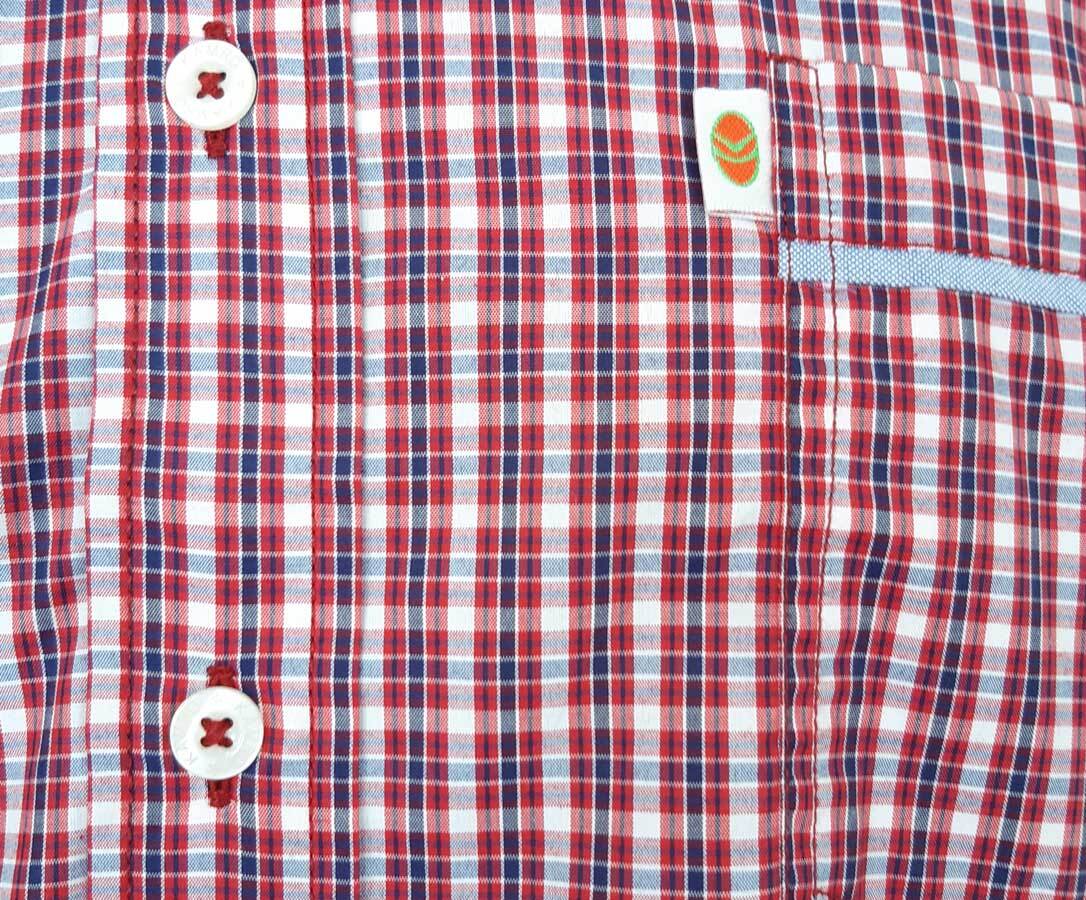 Rød ternet skjorte med korte ærmer fra Kamro. Den har et ternet mønster i rød, hvid og blå.