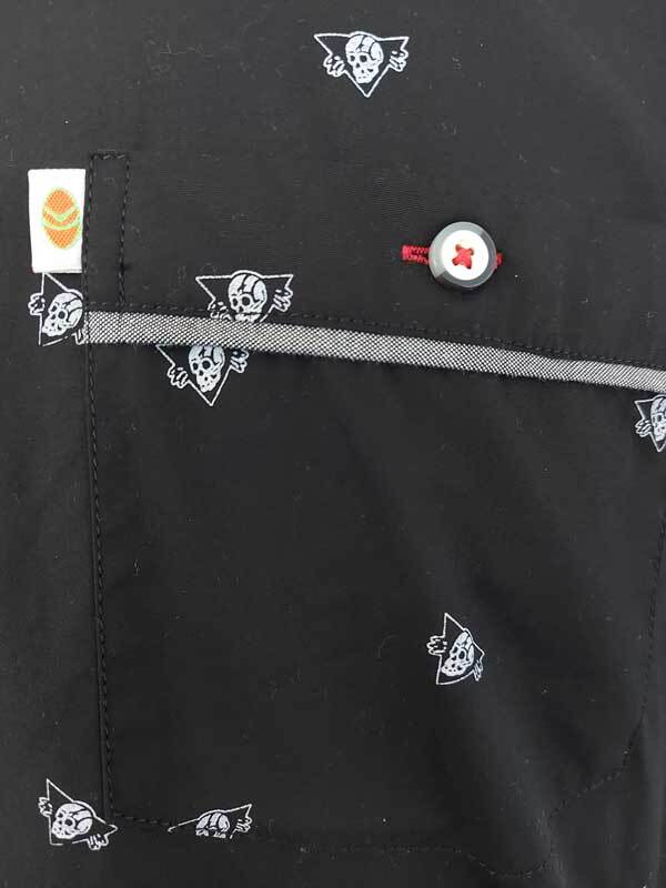 På skjorten er der print med hvide kranier fordelt på hele skjorten. Der er en gråmeleret kontrast på ærmerne, lommen, i kraven og i stolpelukningen.