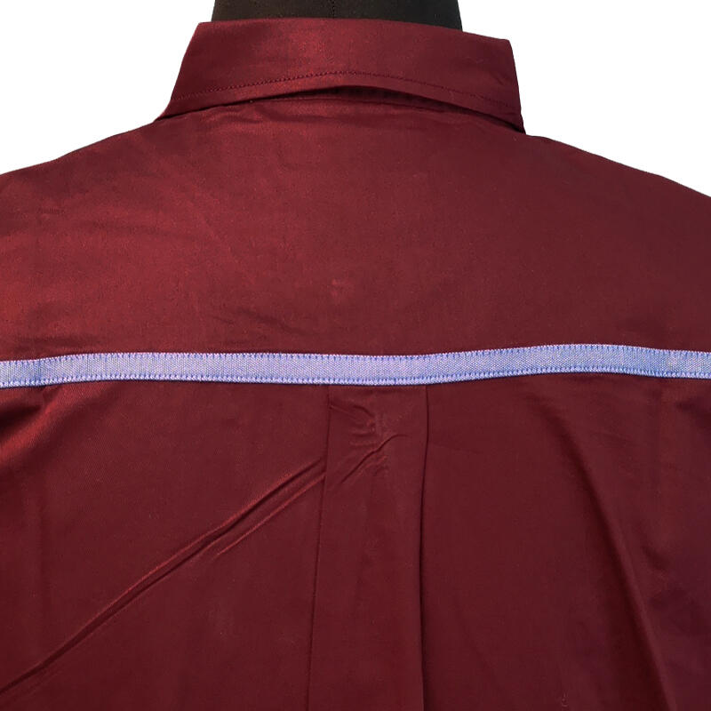Flot vinrød skjorte fra KAMRO med lys denimblå kontrast indvendigt i kraven og under stolpelukningen. Denne farve er ligeledes, som en stribe på brystlommen og hen over ryggen mellem skuldrene.
