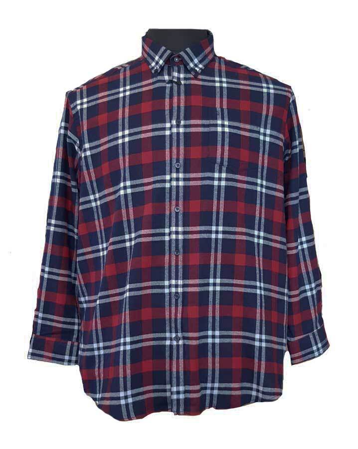 Rød og navy ternet skovmandsskjorte med lange ærmer fra King's Road. Udover rød og navy har skjorten nogle lyseblå streger.