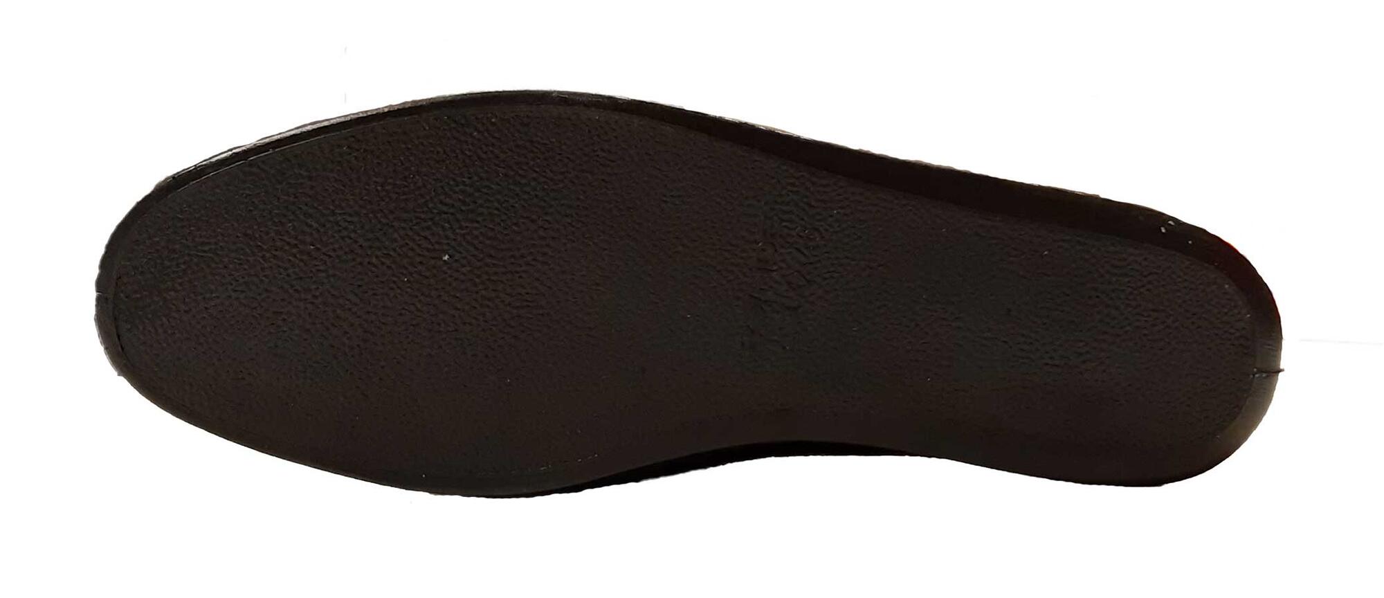 Hjemmeskoene er sorte med sorte kontrastbånd i kanten og sort sål. Der er indsat sort elastik på hver side af vristen, så skoen er nem at tage på.