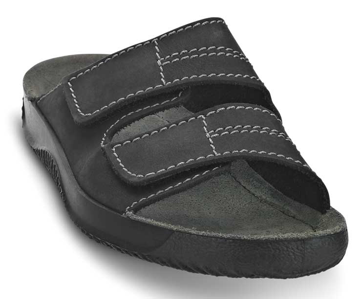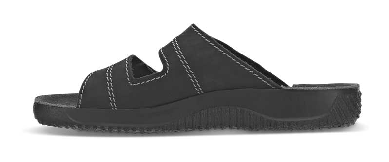 Denne brede herresandal fra Rohde er det oplagte valg, når du vil have både komfort og fleksibilitet. De to justerbare velcroremme gør det nemt at tilpasse sandalen til dine fødder – perfekt, når de bliver varme eller hæver efter en lang dag. Velcroremmene er også ideelle, hvis du har brug for lidt ekstra plads, eller bare foretrækker en mere rummelig pasform. Sandalen er sort med elegante hvide stikninger, som giver et stilrent udtryk. Den grå indersål giver god støtte, mens ydersålen med rillemønster sikrer et skridsikkert fodfæste.