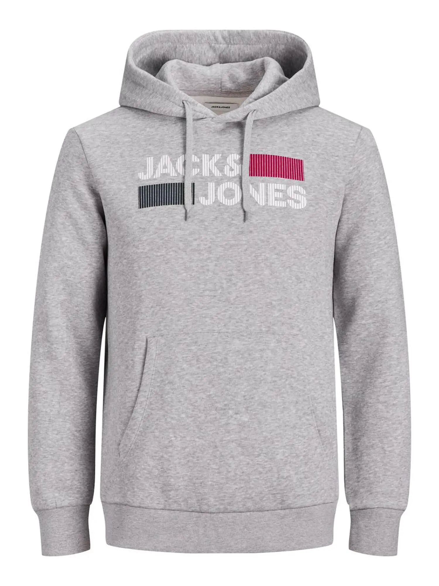 Gråmeleret hoodie fra Jack & Jones. Hættetrøjen har et logotryk foran i rød, hvid og blå og en kængurulomme med en dejlig blød inderside.