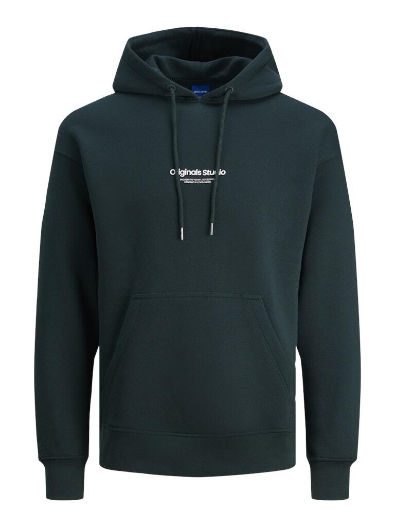 Midt på brystet er der et hvidt gummiprint med teksten "ORIGINALS STUDIO - Brought to you by Jack & Jones. Designed in Copenhagen".