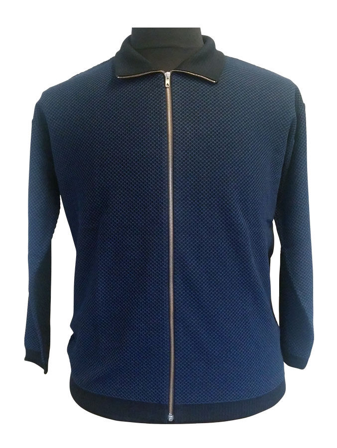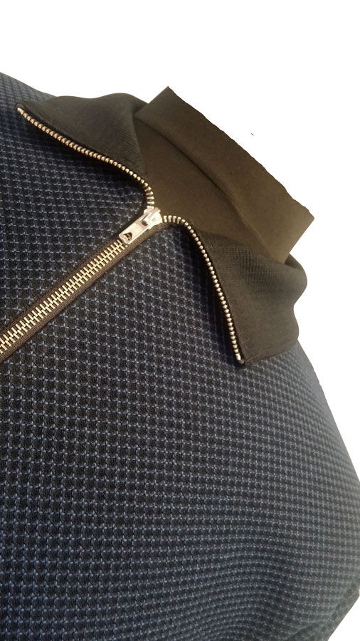 En smart Elkjær cardigan med lynlås. I en blå/sort farve og mønster. Kontrastfarven sort i kraven, på ærmerne og forneden.