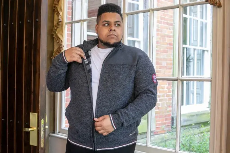 Koksmeleret strikket lynlåstrøje som kan være med til at holde dig varm.