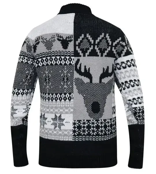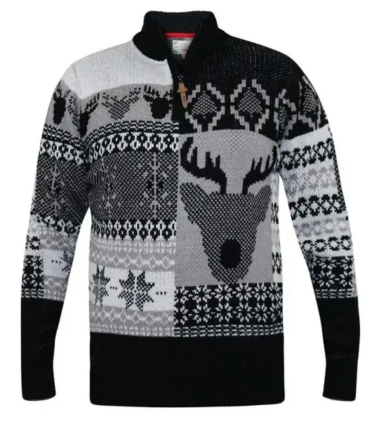 Juletrøje i sort/grå. Denne sweater er lavet i blød akryl, prydet med et unikt motiv af en kronhjort og en praktisk 1/4 lynlås i halsen – den perfekte tilføjelse til din julegarderobe.