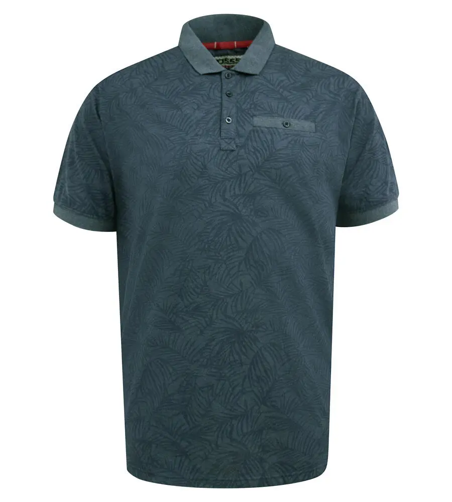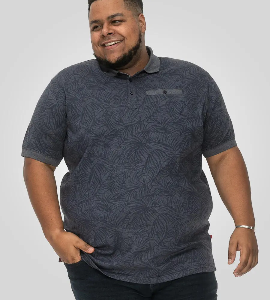 Denimfarvet polo med tone-i-tone bladprint og brystlomme - D555