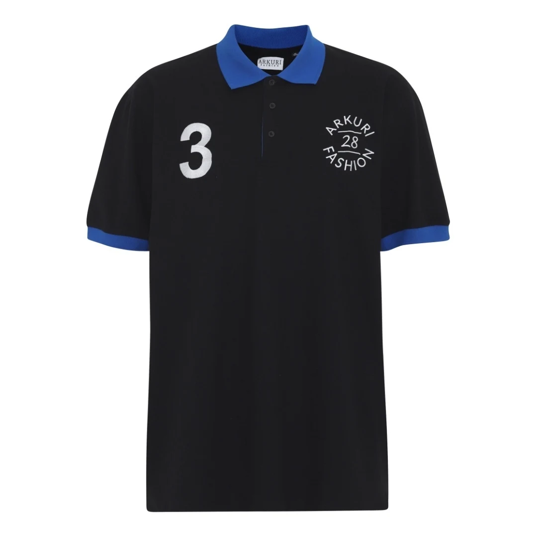 ARKURI Fashion Lux pique polo-shirt med stretch. Polo-shirten er sort med kongeblå kontrast krave Den kongeblå kontrast går igen på ærmeåbningen og på indersiden af stolpelukningen. Polo-shirten har på venstre bryst en rundt broderi, hvor der står "ARKURI Fashion" og i midten står tallet "28". På højre side af brystet er der broderet tallet "3".