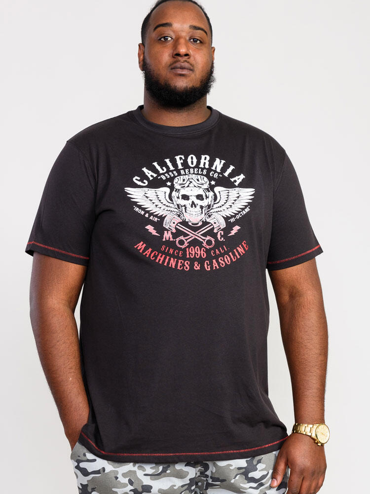 Den vaskede sorte T-shirt er lavet af 100% bomuld og er blød og behagelig at have på. T-shirten er prydet med et stort print på brystet. Printet viser bl.a. teksten "California D555 Rebels Co" samt et "kranie med vinger og motorcykelbriller". Nederst på printet med rødt står der bl.a. "Machines & Gasoline".