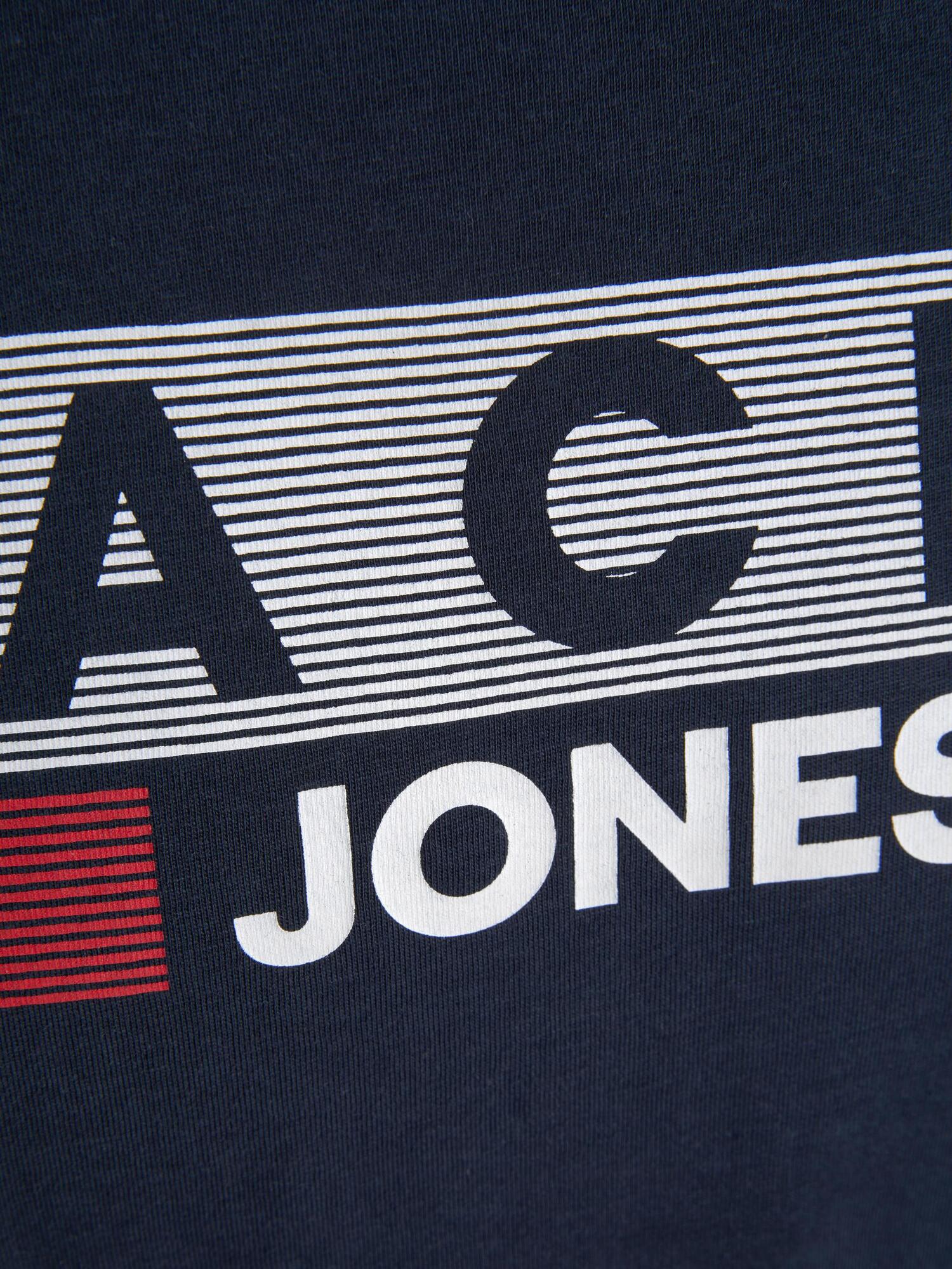En behagelig blød og let T-shirt i navyblå med "Jack & Jones" logo print. Printet er hvid/rødt/navy. T-shirten er med en klassisk rund hals.