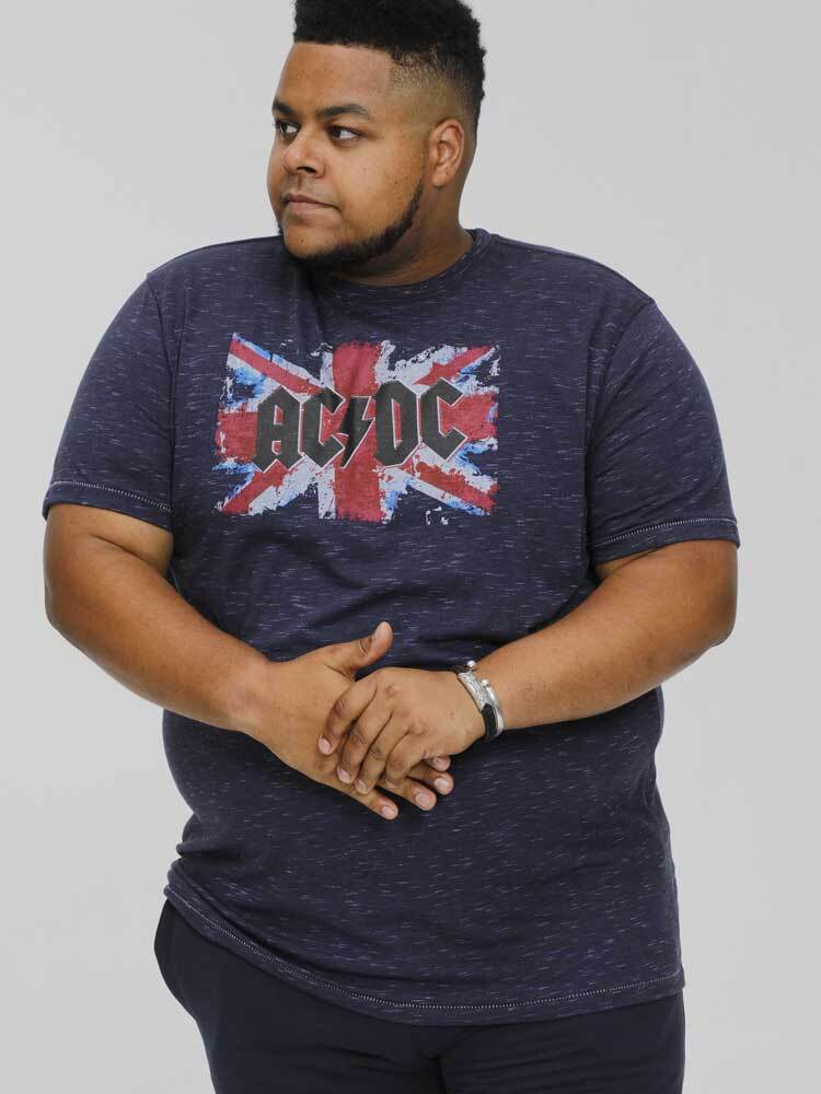 En rå navymeleret statement T-shirt, der er en tidløs hyldest til rock med et autentisk "AC/DC" logo i vintage-look, der komplimenteres i baggrunden af det britiske flag, i et krakeleret udtryk.