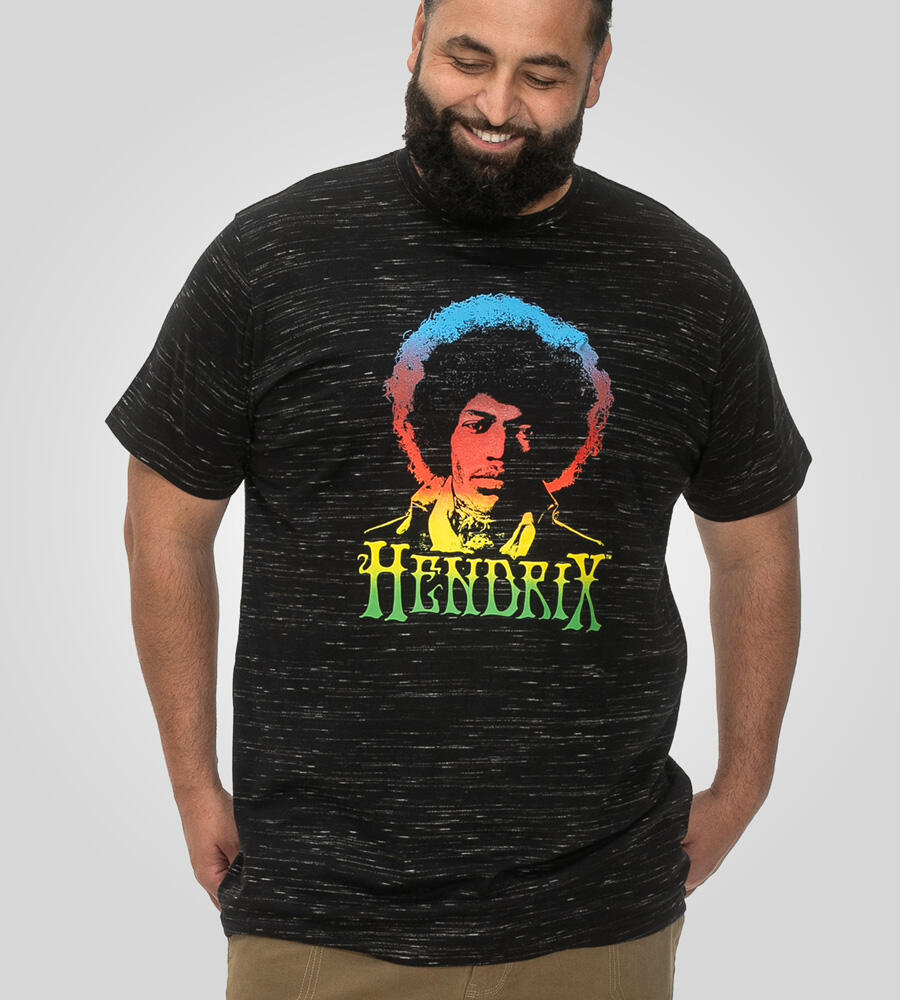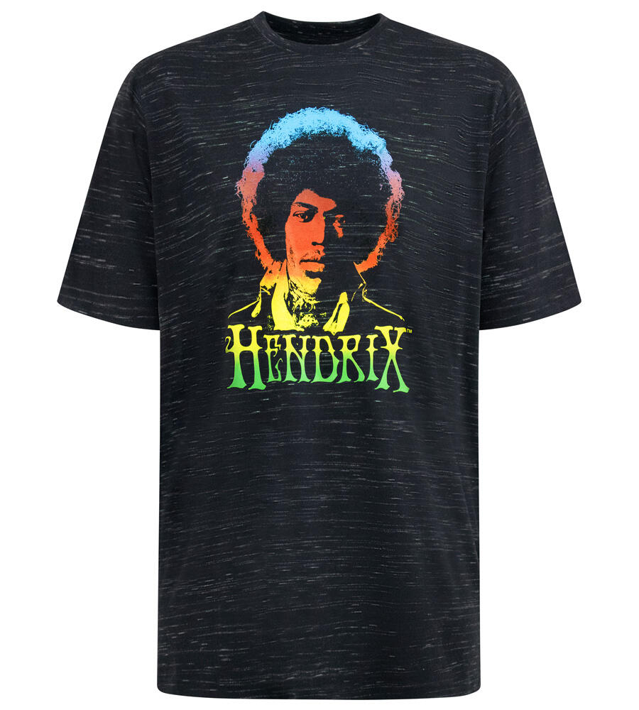 På brystet er der et stort tryk af Jimi Hendrix med hans karakteristiske hår. Ansigtet er lavet i klare farver som rød, gul og blå, der står tydeligt frem mod den mørke, melerede baggrund.