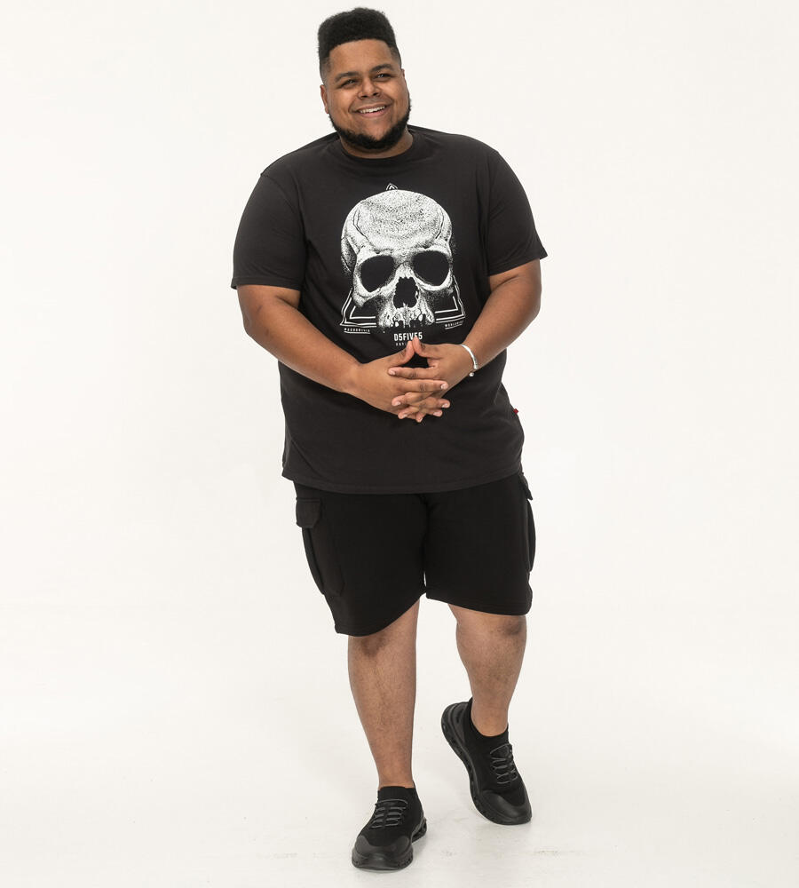 På brystet ses et stort hvidt print af en realistisk kranie-illustration, placeret foran en trekantgrafik for ekstra dybde og kontrast. Under motivet står brandnavnet D5FIVE5 med teksten “Recognised Worldwide – Est. 1996”, som fuldender det grafiske udtryk. En rå og stilren T-shirt med kant, der nemt kan styles til både hverdag og aften.